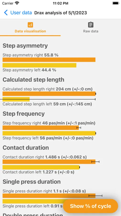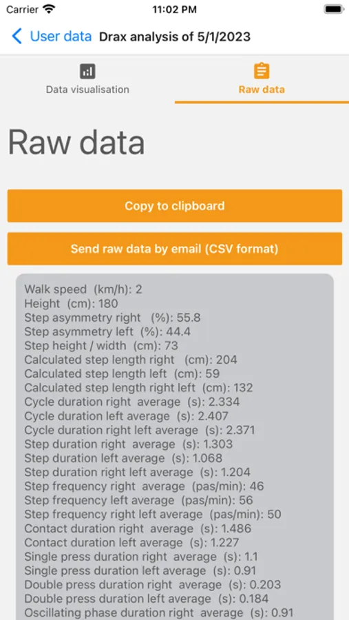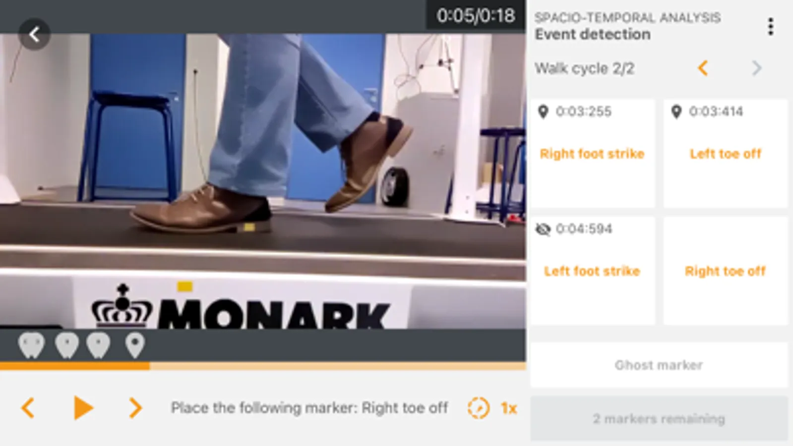 Take a slow motion video with your phone or tablet, and Gait Analyst Pro will provide you the spatio-temporal gait parameters. You can use a video during overground or treadmill walking. You just have to detect the instants when the feet strike and leave the ground from a frame by frame analysis. Once a few steps have been analyzed, Gait Analyst Pro will calculate and present you spatio-temporal gait parameters such as: