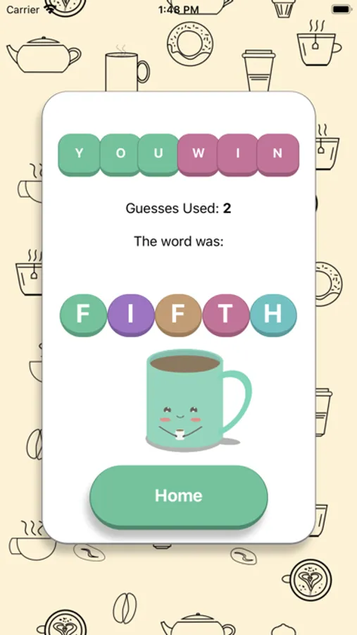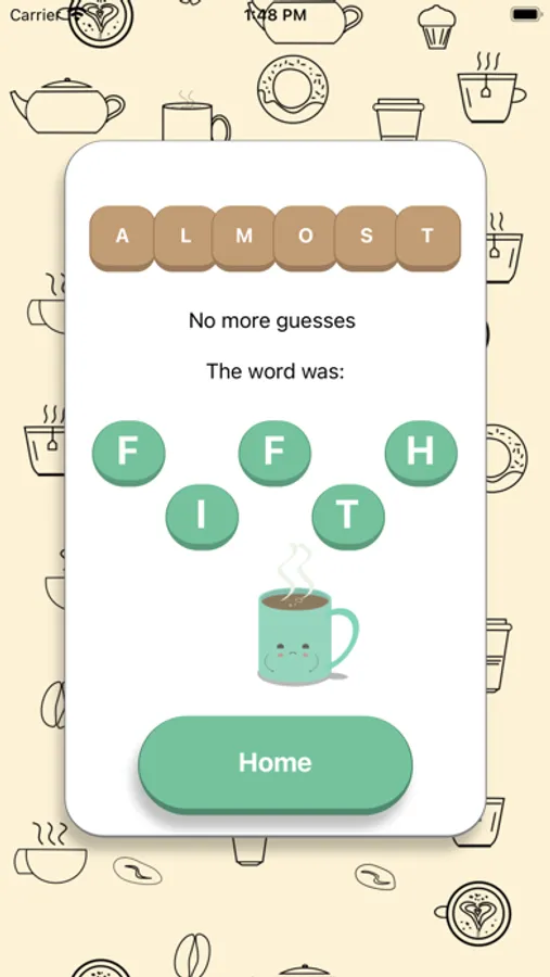 In this coffee-themed game, you'll have 5 attempts to guess the hidden word with helpful hints for every guess. The lofi audio and minimalist design create a calming atmosphere that lets you take your time and test your word skills without any pressure. Are you up for the challenge?"