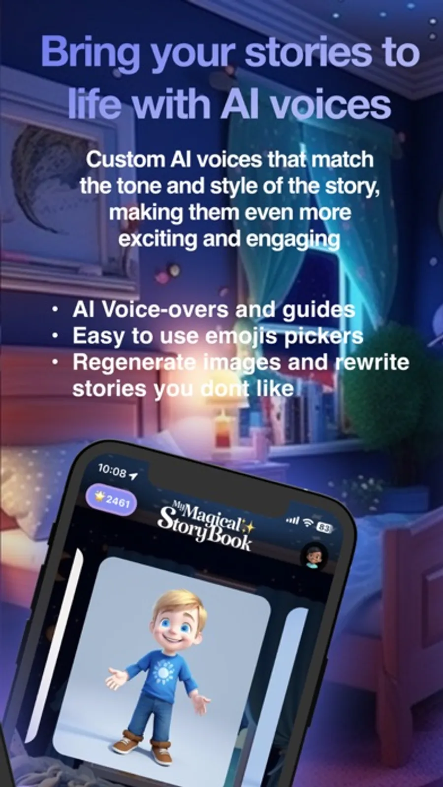 My Magical Story Book uses advanced AI technology to generate custom stories, images and voices, making the stories even more engaging and exciting. Your child can choose from a range of themes and settings to create unique stories and characters, and even share them with friends and family.