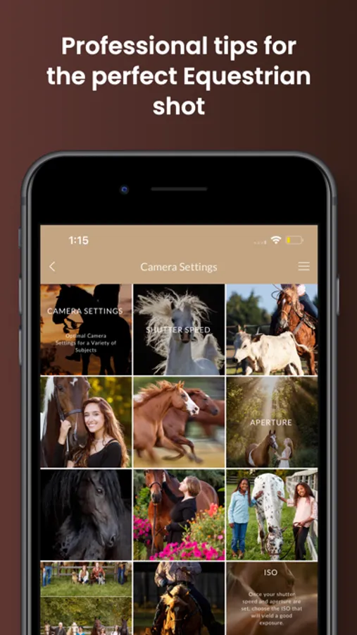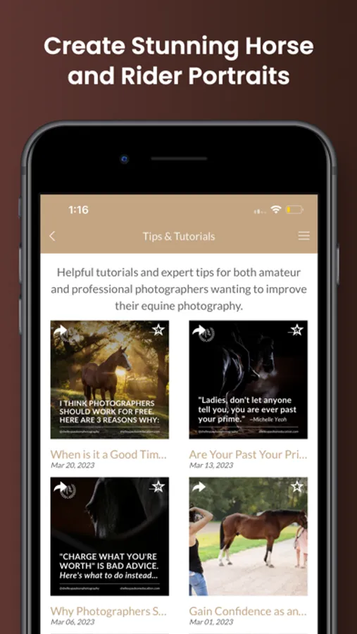 Whether you're a seasoned Equestrian Photographer or are just starting out, this app has everything you need to feel confident capturing beautiful and meaningful photos of horses and the people who love them. It features posing inspiration and prompts, creative ideas, tips and tutorials, affirmations, and more. This easy-to-use app is a must-have for Equine Photographers.