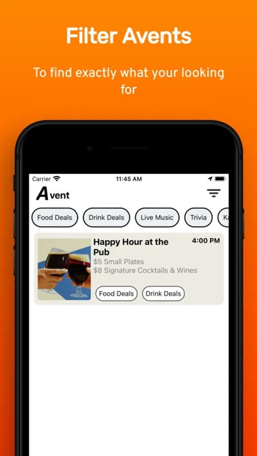 Discover the best local experiences and vibrant venues with Avent, your ultimate guide to happy hours, live music, dancing, and more! Whether you're looking to unwind after work, enjoy a night out with friends, or explore the local entertainment scene, Avent has got you covered.