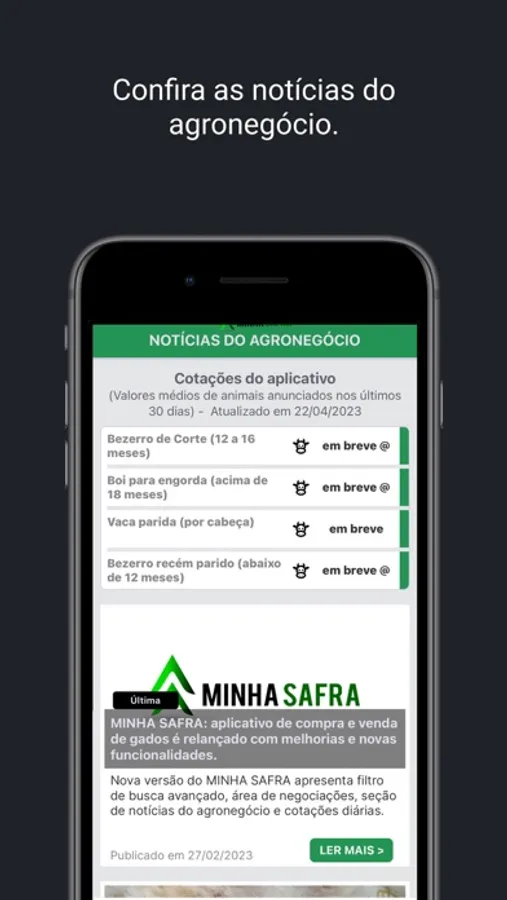 Um aplicativo completo para compra e venda de gados e futuramente fazendas , além de um canal para divulgação de empresas do agronegócio. Com filtros avançados de busca, área de negociações exclusiva e seção de notícias do agronegócio, o Minha Safra oferece segurança, transparência e praticidade para seus usuários. O aplicativo também apresenta diariamente as cotações atualizadas dos animais , ajudando os usuários a tomar decisões informadas sobre suas transações.