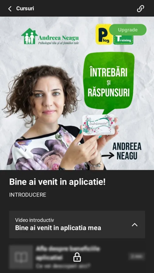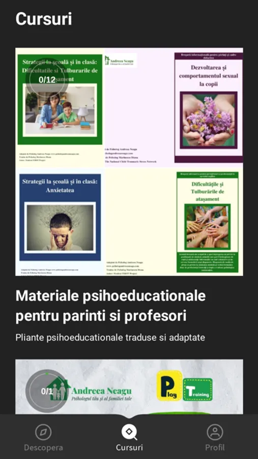 In cadrul aplicatiei vei gasi cursuri actualizate pe teme legate de evaluarea psihologica si terapia copiilor si a familiei. Intra in comunitatea de specialisti in sanatate mintala formati de Andreea Neagu si descopera resurse extrem de utile pentru practica ta. Instalarea aplicatiei este gratuita.