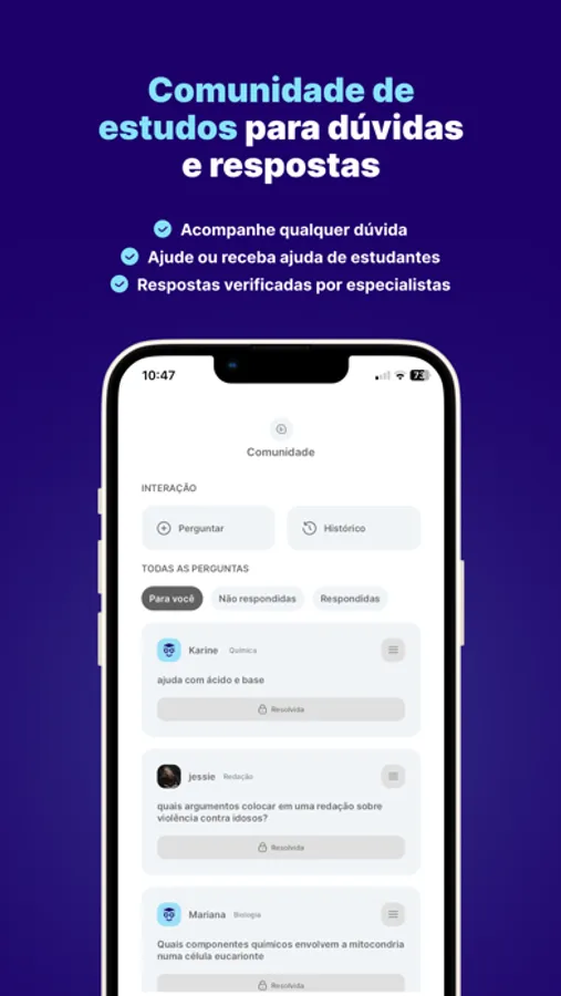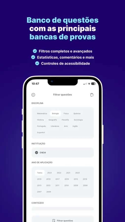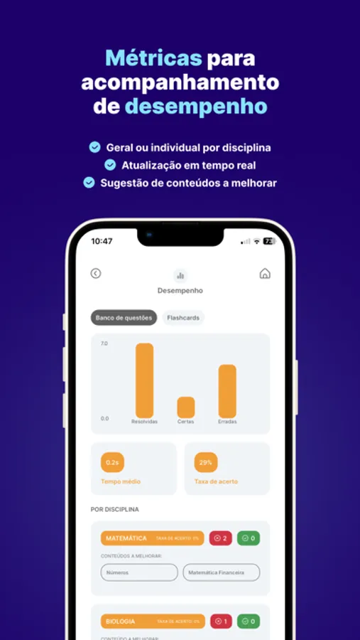 - Métricas de desempenho: Acompanhe o seu progresso com relatórios detalhados sobre o seu estudo. Descubra as taxas de acerto e identifique os conteúdos que precisam de mais atenção.