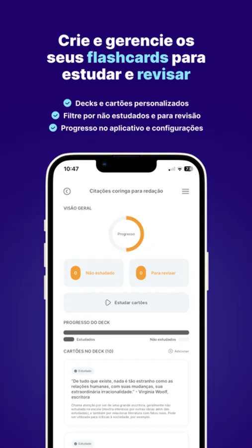 - Flashcards para memorização eficiente: Crie cartões e decks de flashcards para tornar a memorização de conteúdo mais fácil e prática. Revise cartões não estudados com um único clique.