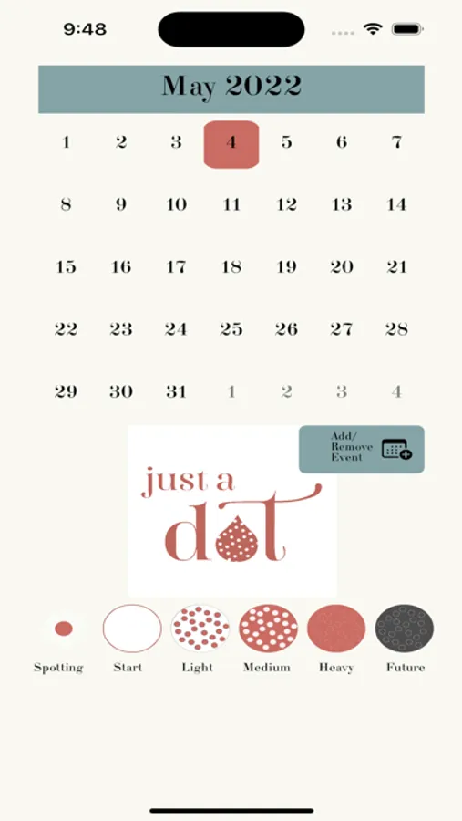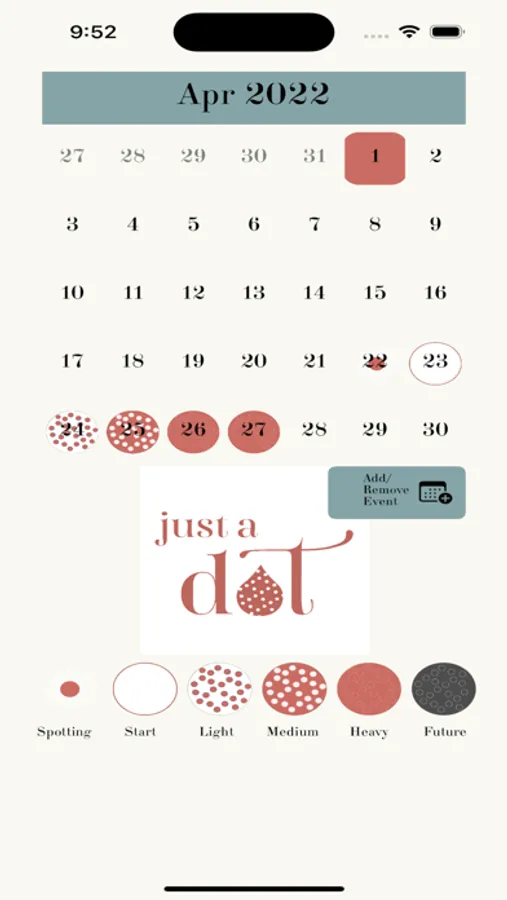 If you are looking for a quick and easy way to track your period, this easy to use calendar will be perfect for you! With the touch of your finger you can track your light days, heavy days and everything in between. Just A Dot will even alert you when your next period may arrive. This app is the perfect way to track your period (and only your period) in an easy, private way. Perfect for teens and adults.