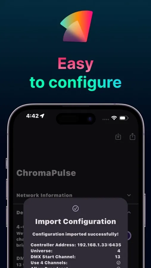 Designed for use in theaters and other performance venues, ChromaPulse allows you to control the color, intensity, and timing of your display lights with just a few taps on your device. Whether you're looking to create an immersive backdrop for your play or add dramatic accents to your musical performance, ChromaPulse makes it easy to achieve the perfect lighting effects.