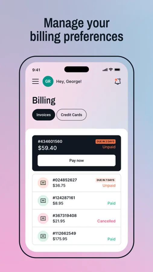 - Manage, view and pay your account invoices through the app's dedicated billing section.