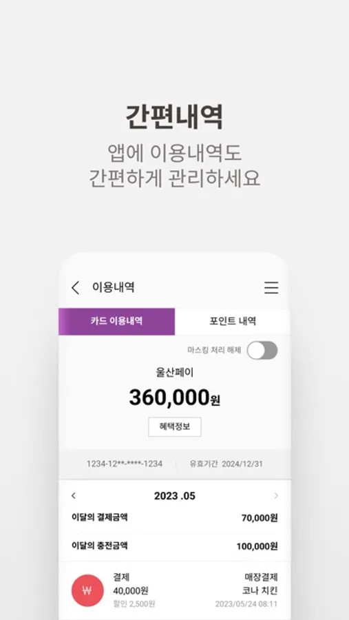 - 앱에서 편리하게 카드 충전 및 이용 내역 조회