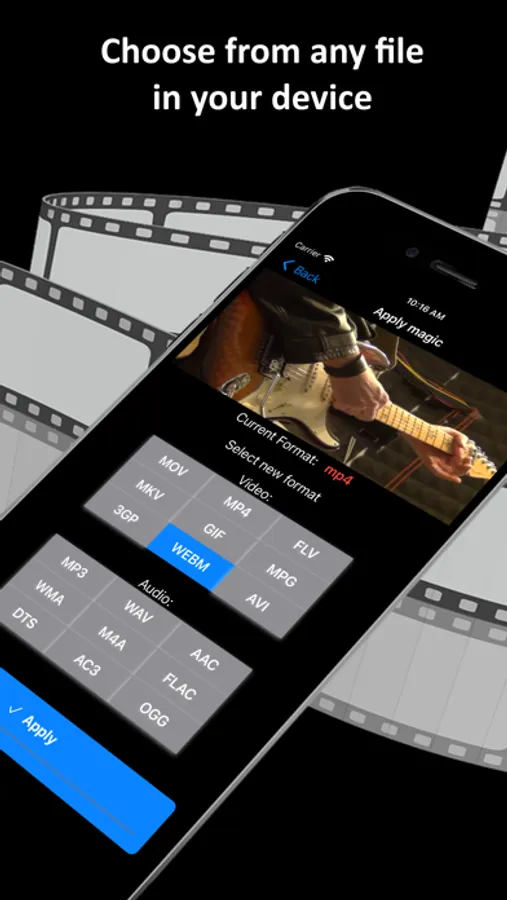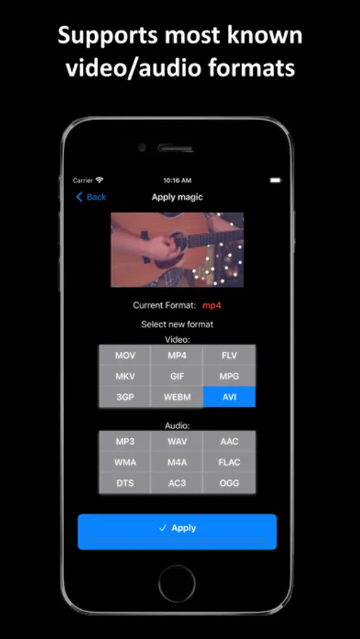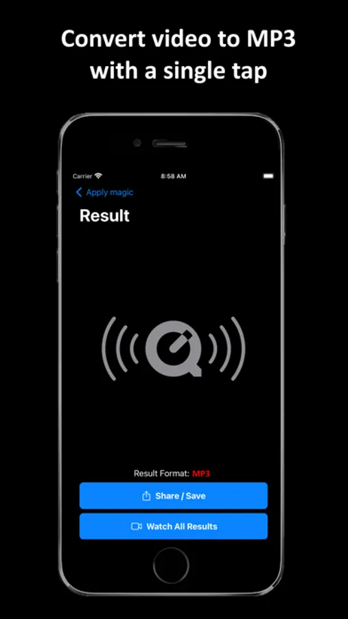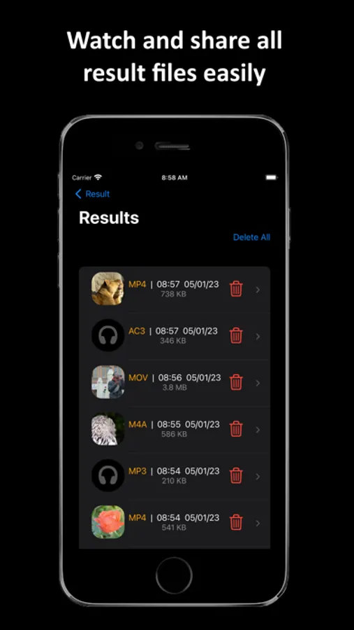 * Convert video or audio files to other formats. Then save the results or share them with friends using any other social app.