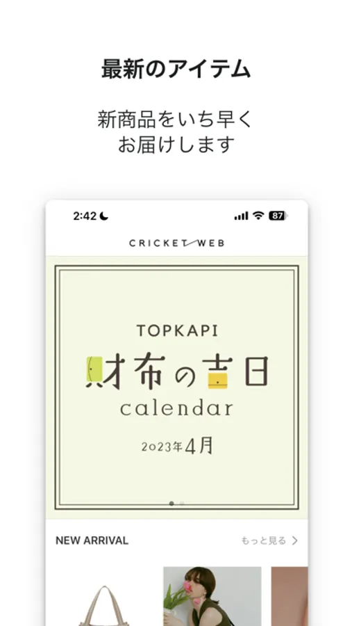 TOPKAPI(トプカピ)、Breath TOPKAPI(ブレス トプカピ)、EFOLE(エフォル)、TREASURE TOPKAPI(トレジャー トプカピ)、ethimere(エシミヤ)、CRICKET(クリケット)を展開するCRICKET WEB(クリケットウェブ)の公式アプリ。