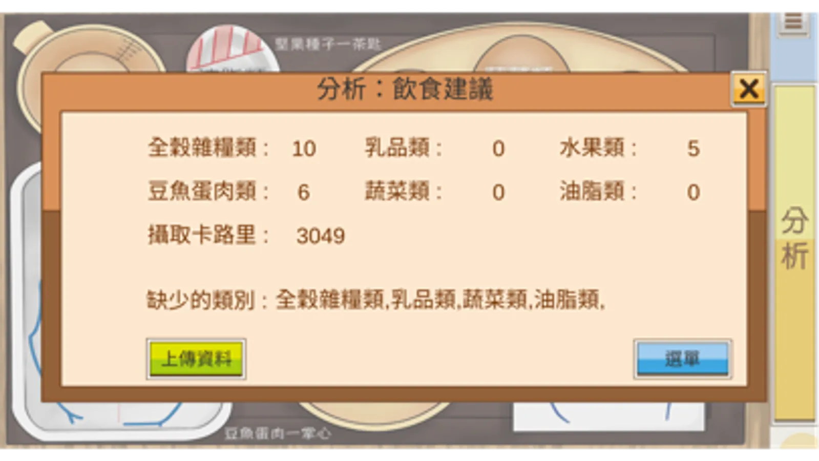 遊戲裡提供生活上常見的124種食物,方便玩家根據自身飲食習慣自行輸入,系統會告知您今天攝取的卡路里或是否均衡飲食。