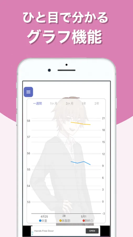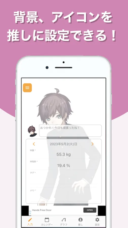 好きな推しを背景、アイコンに設定できるだけでなく、シンプルな入力画面、見やすいリスト形式のカレンダー、体重、体脂肪、BMIの推移が直感的に分かるグラフ機能があるのでとても楽に体重記録ができると思います!