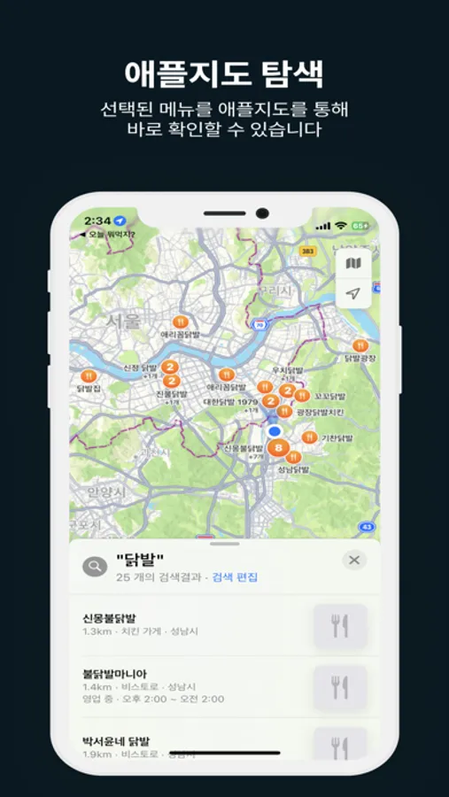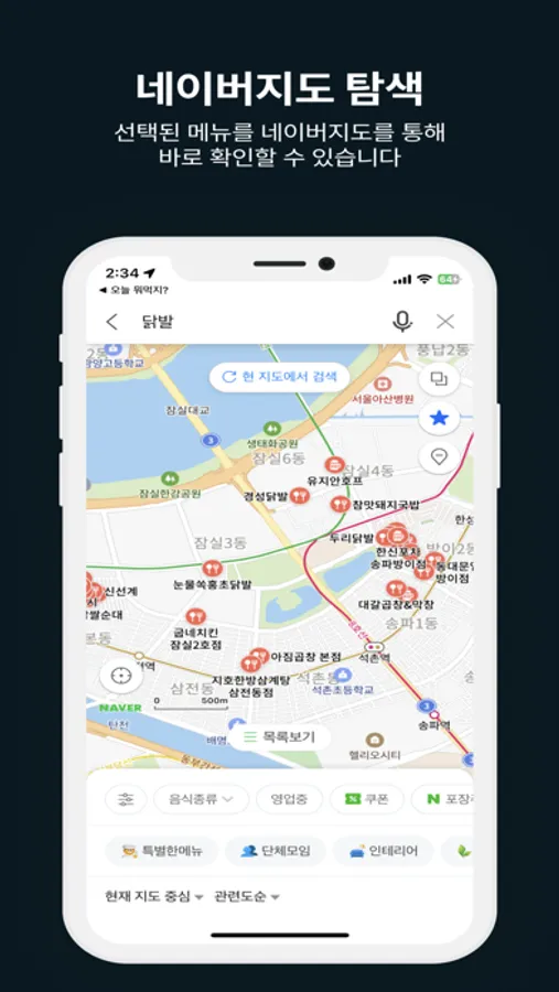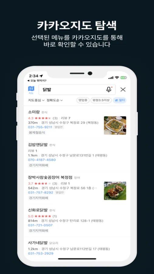 원하는 메뉴가 나오면 여러가지 지도와 배달어플을 연결하여 음식점을 즉시 확인할 수 있습니다.
