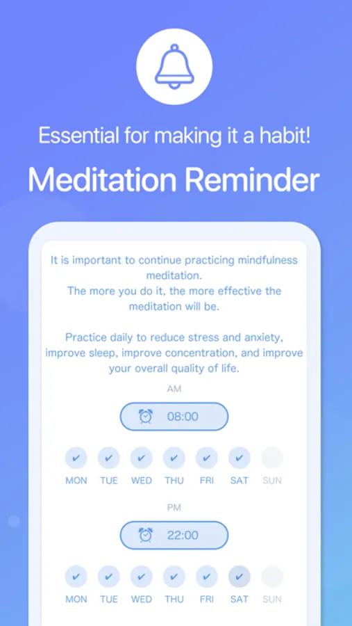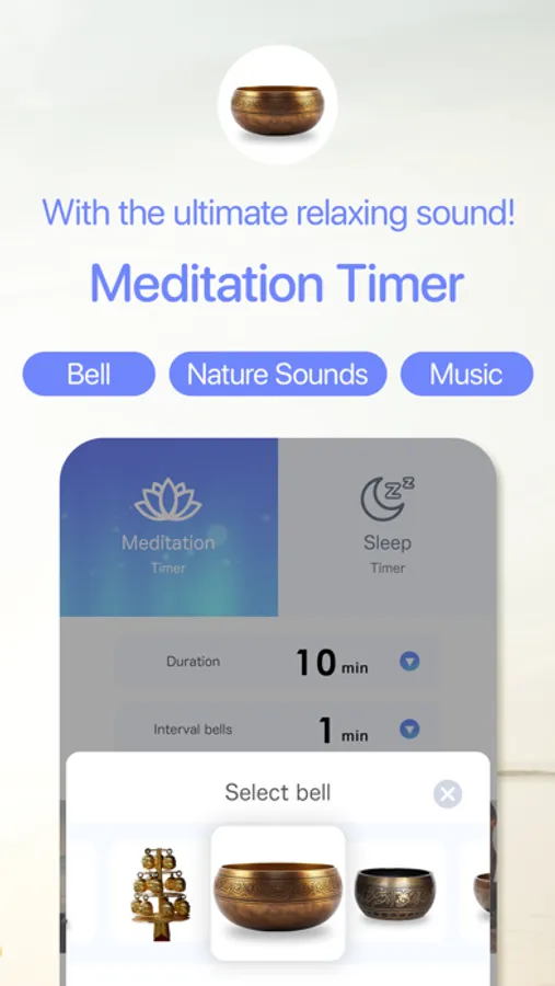- By setting the interval sound and end sound, you don't have to worry about the clock during meditation, you can concentrate on meditation and maintain a relaxed state.