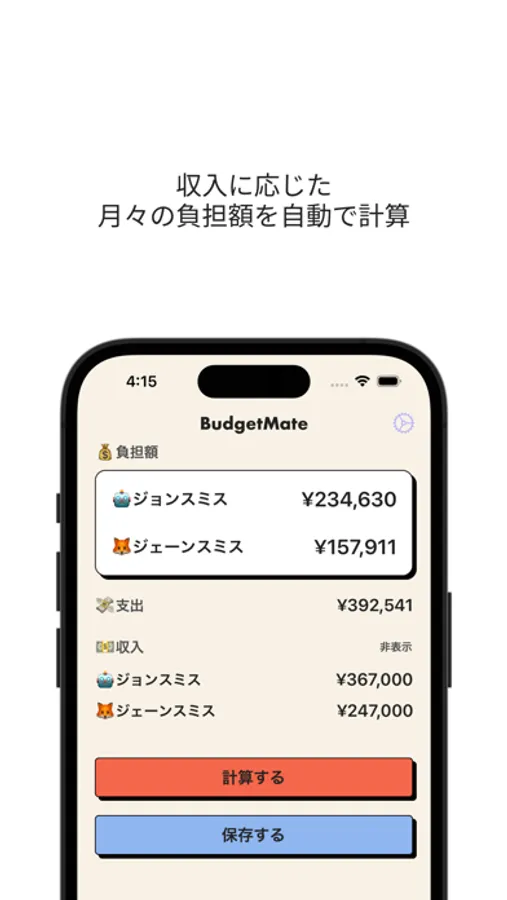 BudgetMateは、あなたの収入と支出のバランスを手軽に管理できるアプリです。わずらわしい手計算から解放され、支出に対して収入に応じた負担額を自動で計算してくれます。お金の管理が苦手な方でも安心してご利用いただけます。