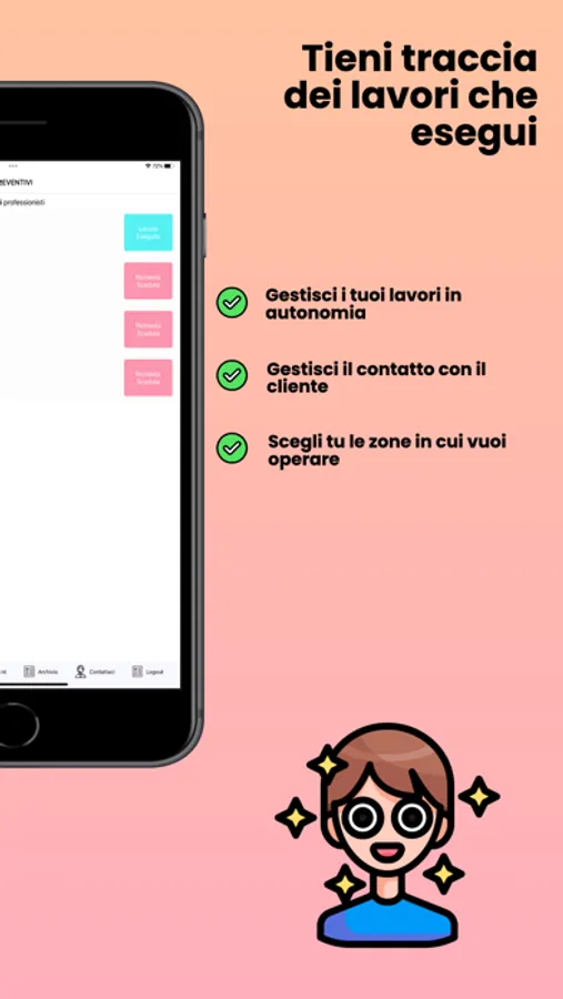 L’App permette di registrarsi gratuitamente, scegliere un’area di intervento, e scegliere una o più professioni che si è in grado di svolgere.