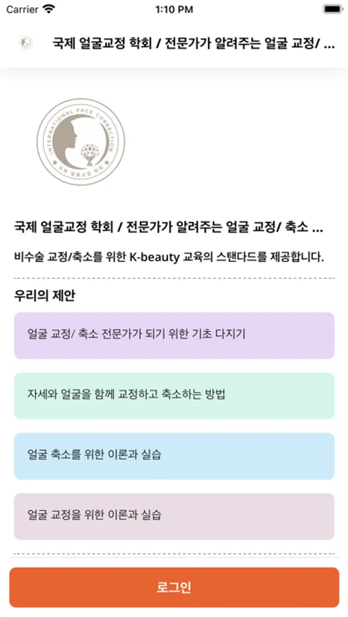 국제 얼굴교정 학회 앱은 국제 얼굴 교정학회에서 제공하는 비수술 얼굴 교정과 얼굴 축소 교육을 쉽게 체험하고 배워 나갈 수 있는 앱입니다. 이 앱에서는 차별화된 온라인 교육, Q&A, 얼굴 상담 등 핵심 서비스를 제공합니다. 아주 기초적인 부분부터 전문적인 영역까지 모두 컨텐츠로 담아 두었고, 실제 오프라인에서 모여 연습할 수 있는 교육도 준비해 두었습니다. 또한 교육 후에도 후속 관리 등을 통해 보다 완벽한 얼굴 축소 및 교정을 위한 서비스를 제공하기 위한 프로그램을 준비하고 있습니다. 언제 어디서든 간편하게 교육 및 상담을 받아 보세요.
