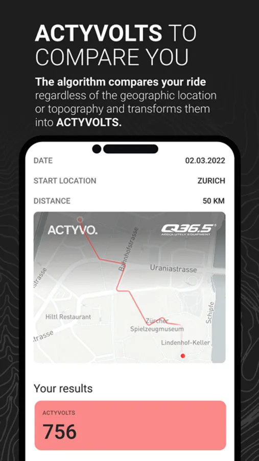 The distance is defined in advance via app and analyzed using the new algorithm. After finishing the race, the altitude, time, and performance of the participants will be measured and compared. The result of the performance is measured in the unit “ACTYVOLTS”. The higher this value is, the better