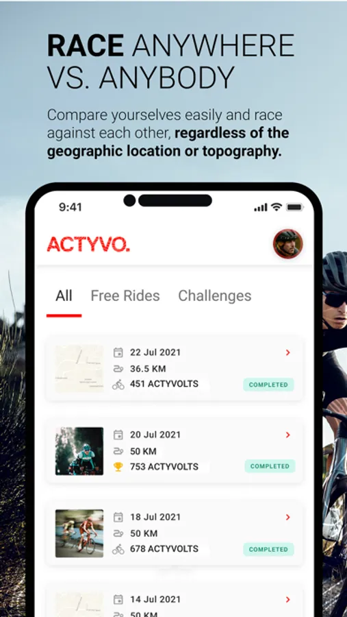 ACTYVO is the first outdoor cycling app that makes it possible to challenge road cycling enthusiasts around the world to a race thanks to cutting-edge technology and innovation.