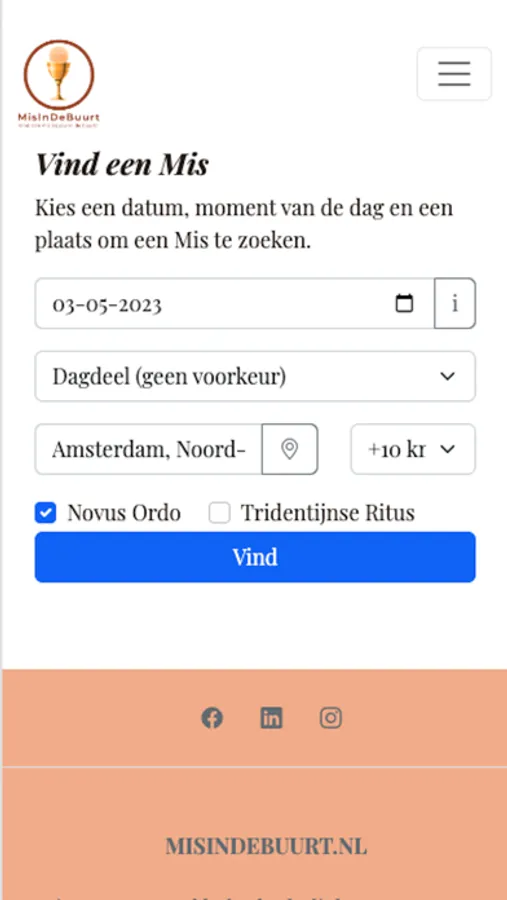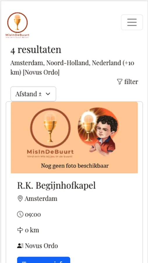 MisInDeBuurt is een website en app die je helpt om een Heilige Mis (ofwel Eucharistieviering) te vinden bij jou in de buurt, zelfs als je op vakantie of zakenreis in Nederland bent. Hoewel er al verschillende websites zijn om een H. Mis in de buurt te vinden, hebben deze vaak hun beperkingen. Bijvoorbeeld, de mistijden zijn niet altijd up-to-date.