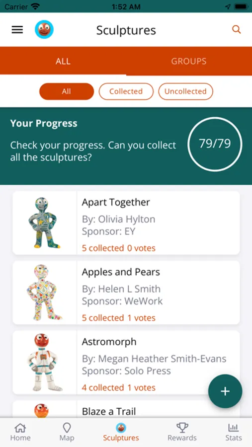 Art trail app includes: map, sculpture listings, design inspiration, sculpture and milestone rewards, sculpture galleries, voting, trail stats, social sharing and event listings.