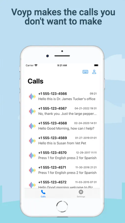 Download VOYP now and let your virtual voice assistant make your phone calls so you don't have to! Provide the details for your call and VOYP will speak on your behalf to get you the information or assistance you need.