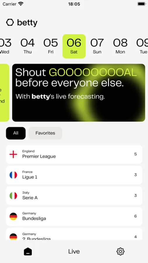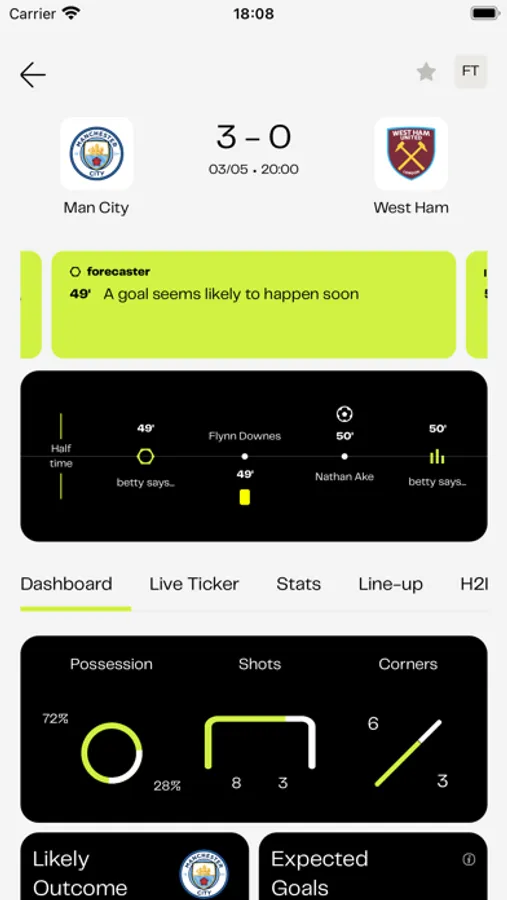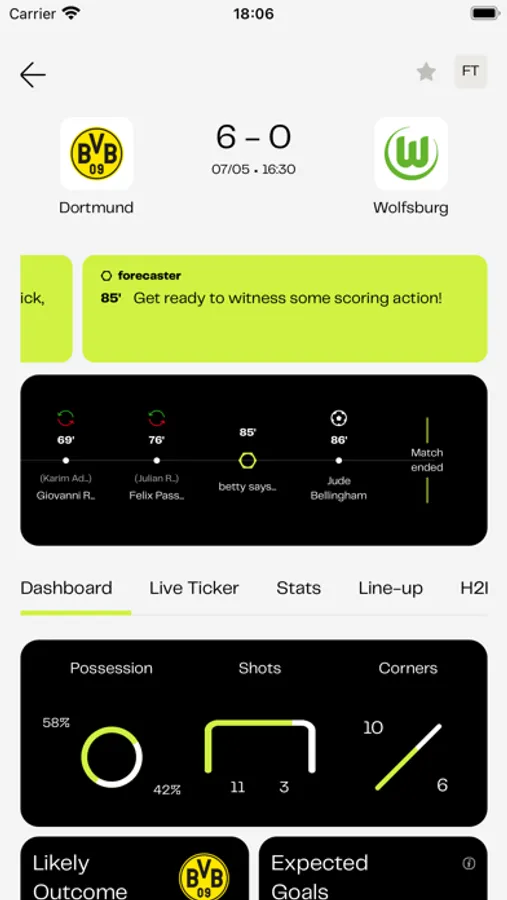 betty uses advanced algorithms to analyse real-time data from football games and provide predictive insights on goals and other key moments of the game. Our app is constantly learning and improving, so you can be sure that you're getting the most accurate and up-to-date information available.