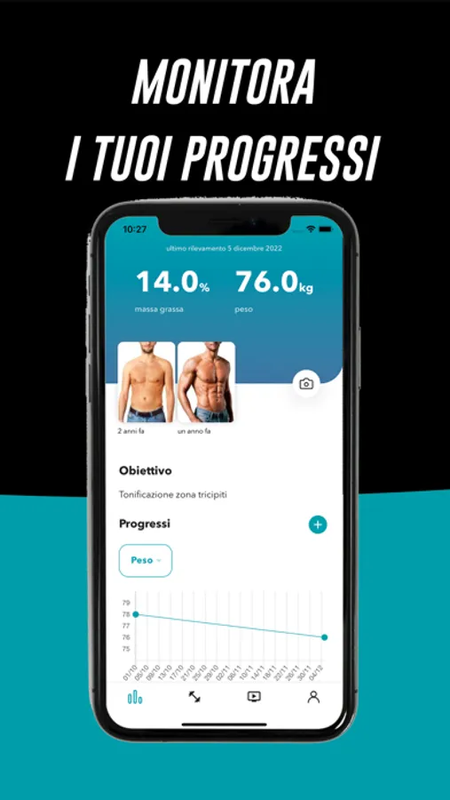 Avrai sempre sotto controllo la tua attività fisica: potrai visualizzare quali esercizi sono previsti nel tuo piano di allenamento, i tuoi progressi e come cambia il tuo fisico nel corso del tempo.