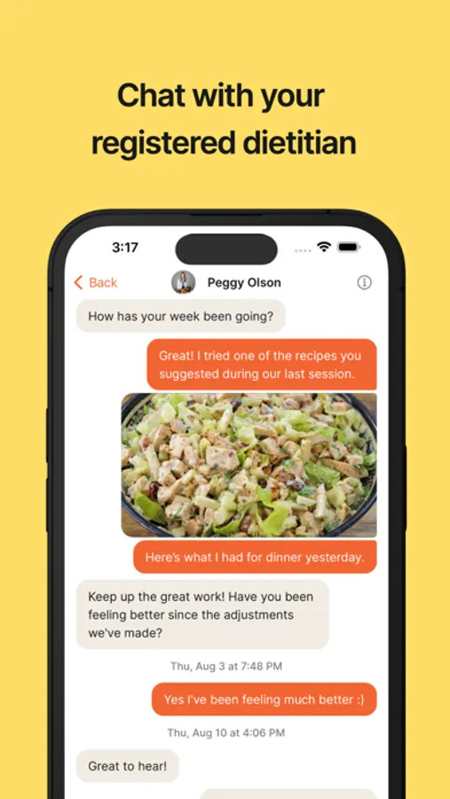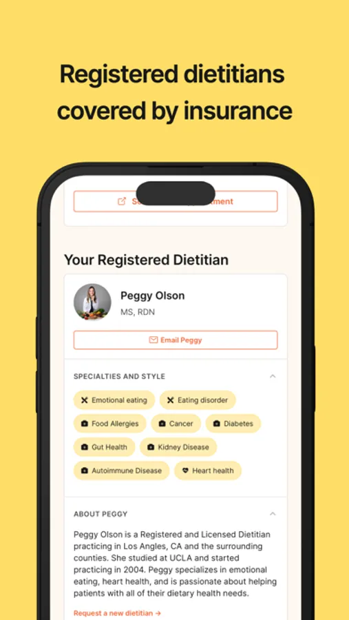 • View summaries written by your registered dietitian and the status of your insurance claims for past appointments