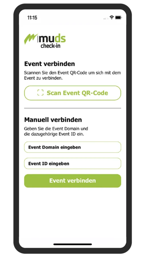 App-Anmeldung über Event QR-Code oder durch manuelle Eingabe.