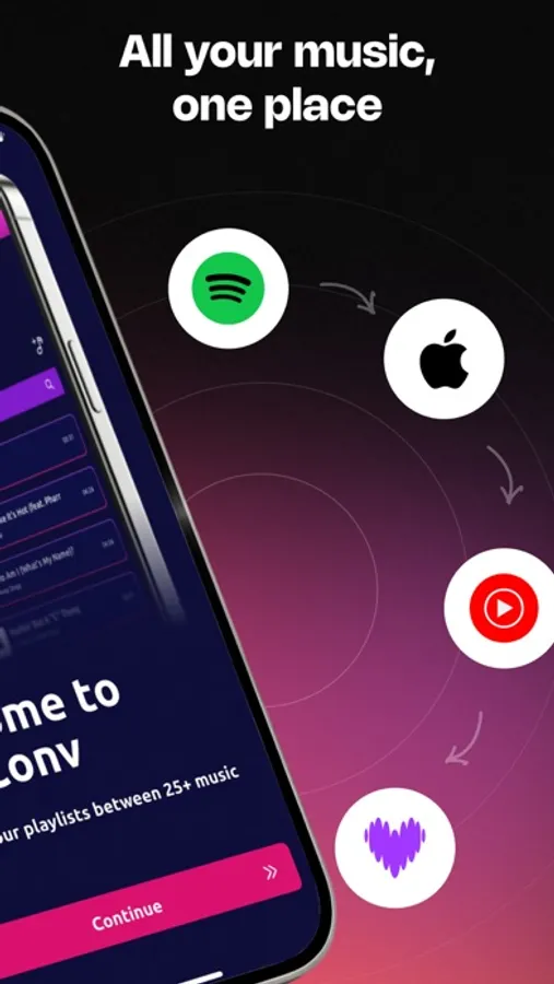 MusConv makes transferring playlists and syncing your music across all major streaming platforms fast and effortless. Whether you're switching from Spotify to Apple Music, Apple Music to Spotify, or organizing tracks across TIDAL, Amazon Music, YouTube Music, or SoundCloud — we ensure a seamless, stress-free experience.