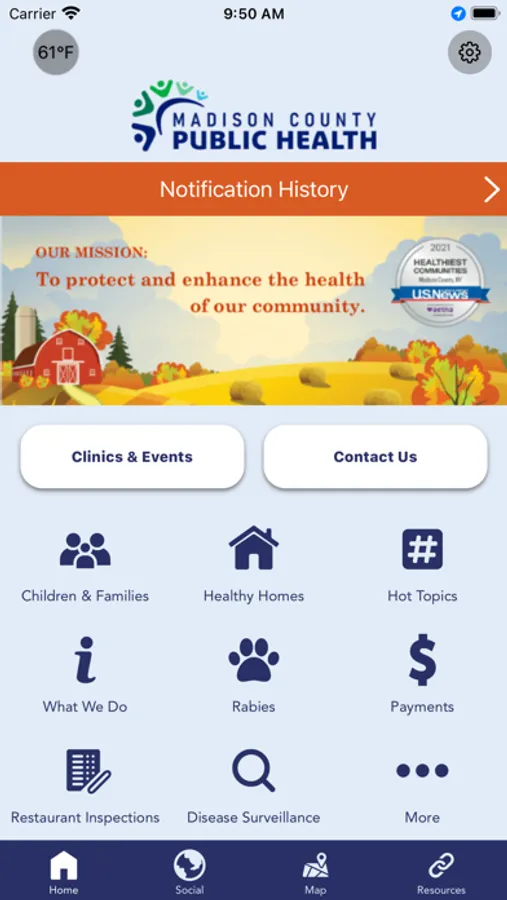 This app includes easy access to immunization and rabies clinics, restaurant inspection results, emerging health topics, chronic and communicable disease information, county health programs and services, and more.