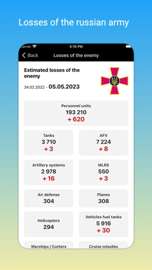 - Losses of the russian army in Ukraine today. Information is displayed in a convenient format by category. On the main screen, you can see what day of the war it is today since the start of the full-scale invasion. The information is updated automatically every day.