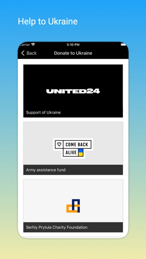 - Quick access to the best charitable foundations, with which you can help the Ukrainian army and people.