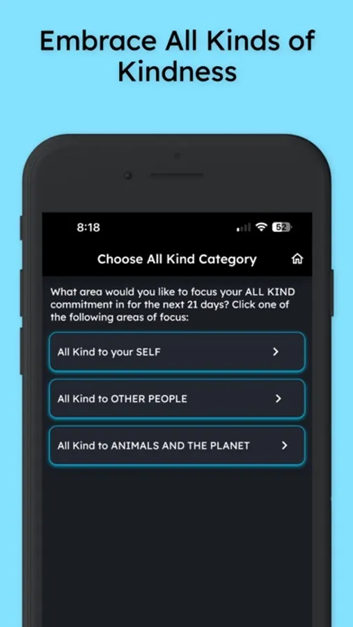* Wide Range of Kindness Commitments: Choose from variety of pre-defined commitments, each thoughtfully designed to foster kindness and compassion in three categories-kindness to Self, Others, or Animals and the Planet.
