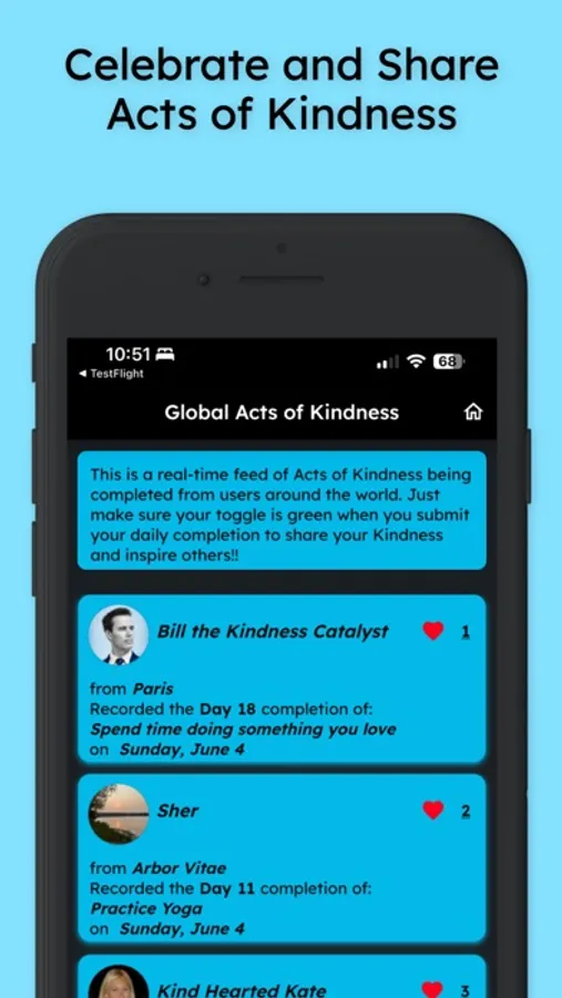 * Share Your Journey: Share your daily accomplished acts of kindness with the community and inspire others.