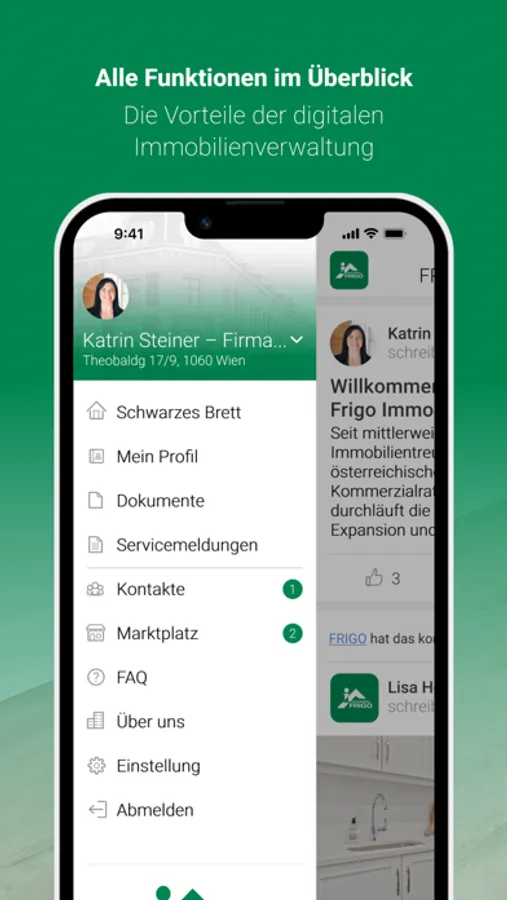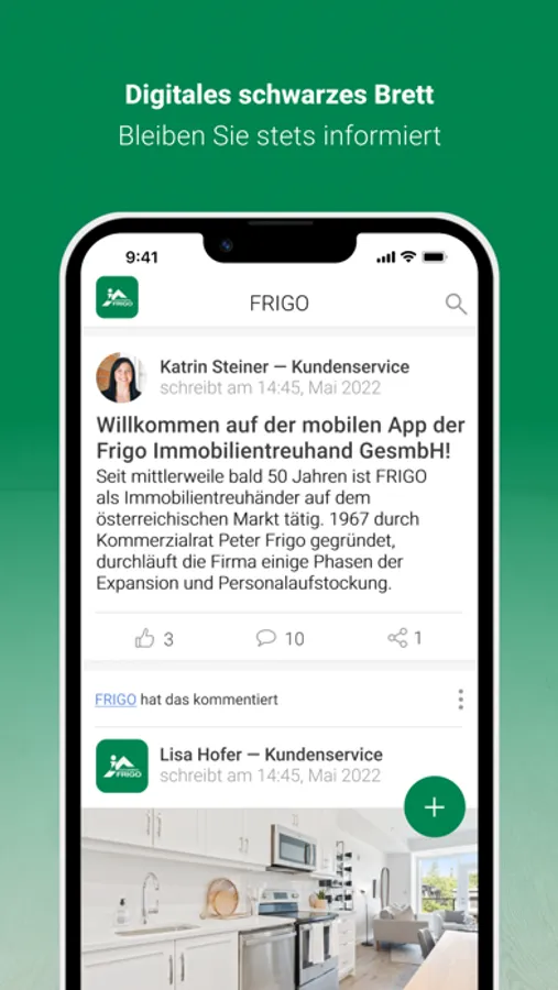 Als Kunde der FRIGO Immobilientreuhand GesmbH profitieren Sie von einem besonders innovativen Kundenservice, der Ihnen viele Freiheiten bietet. Mit der FRIGO App können Sie uns rund um die Uhr Anliegen und Schäden inklusive Fotodokumentation per Smartphone melden. Zusätzlich stellen wir Ihnen eine digitale Dokumentenmappe mit wichtigen Dokumenten für Ihre Immobilie(n) zur Verfügung. Über das digitale schwarze Brett informieren wir via Push-Nachricht proaktiv über wichtige Informationen rund um die uns anvertrauten Immobilien.