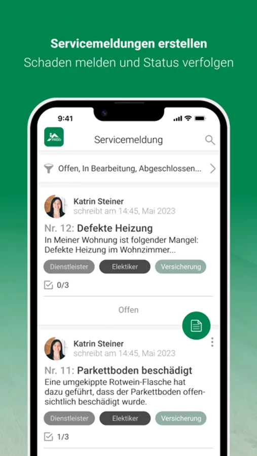 - Interaktiv: Sie können in der FRIGO App direkt Schadensmeldungen oder andere Anliegen mit Fotos erfassen. Ihr Sachverhalt wird schnell bearbeitet und Sie erhalten regelmäßige Status-Updates per Push-Nachrichten.