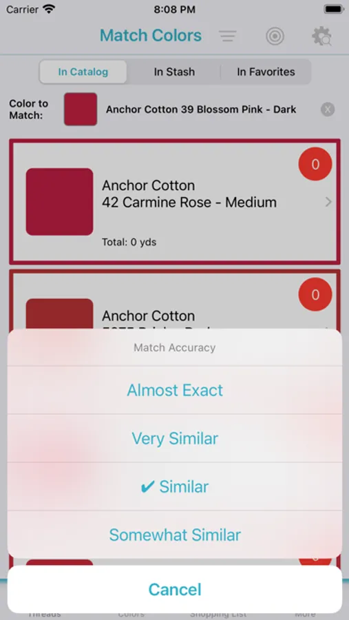 - Select a thread like DMC Cotton 321 Red to find threads that are similar in color across brands. Adjust the accuracy of the color match to see more or fewer results.