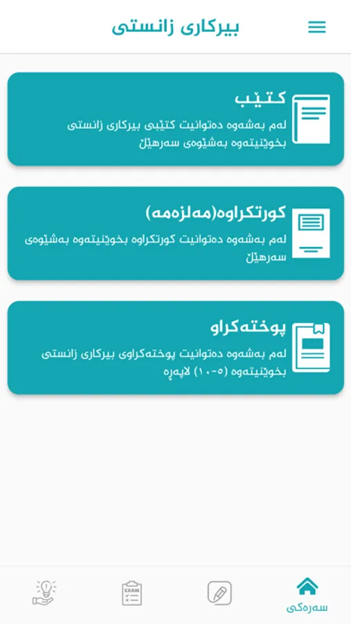 وەهەروەها بەشێکی ناوەزەشمان بۆ ئامادەکردوون بە ناوەی بەشی پرسارەکان بە پێیی بەشەکانی کتێب کە بەم زوانە بەردەست دەبێت.