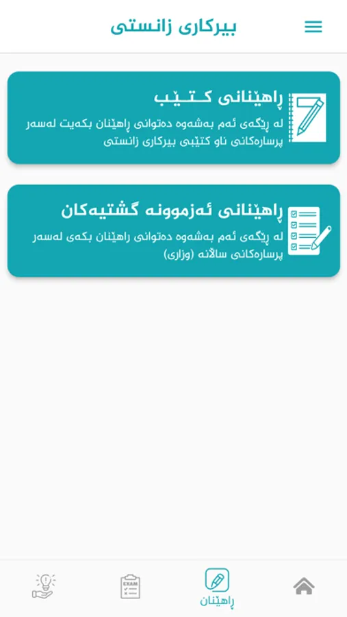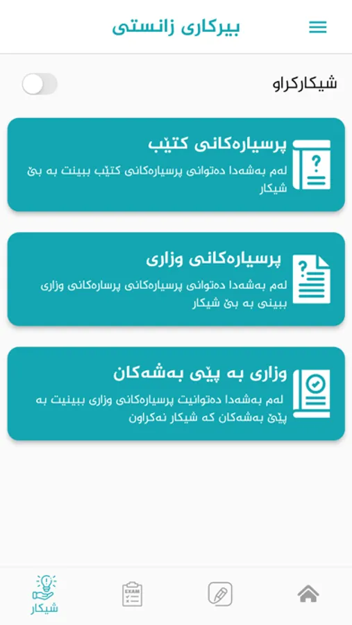 بۆ بیرکاری زانستی پرسارەکانی وزاری لە ساڵی ٢٠١٤ وە بۆ خۆلی یەکەم وخولی دووەم و تەهمیدی واتا نزیکەی پێنج سەد پرسیار بەردەستە لەگەڵ زیاتر لە هەزار پرساری گرنگی ناو کتێب کە بەم زوانە بەردەست دەبێت