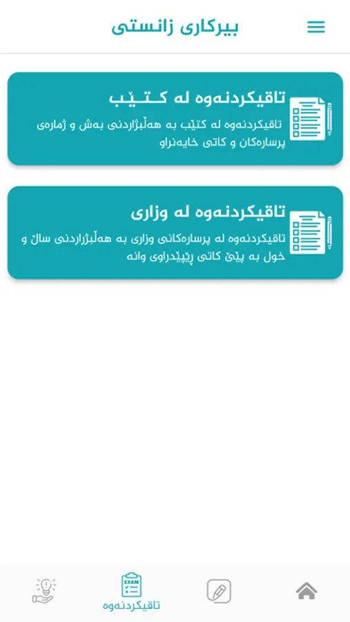 بەشی تاقیکردنەوە : ئەم بەشە تایبەتە بە ئەنجامدانی تاقیکردنەوە لەسەر پرسیارە گرنگەکانی ناو کتێب بە هەڵبژرادنی بەش و ژمارەی ئەو پرسیارەکان و کاتی تاقیکردنەوە، هەروەها تاقیکردنەوە لە پرسیارەکانی وزاری بە شێوەی هەڵبژراردنی ساڵ و خول (خولی یەکەم، خولی دووەم، بەرایی) وە کاتی تاقیکردنەوەی ئەزموونە گشتەکانمان لە وانەکە داناوە بۆ مۆدی تاقیکردنەوەی پرسیارەکانی وزاری بۆ ئەوەی قوتابیان و خوێندکاران وا هەست بکەن و ئەزموون بکەن کە لە تاقیکردنەوەی ئەزموونە گشتیەکاندان.