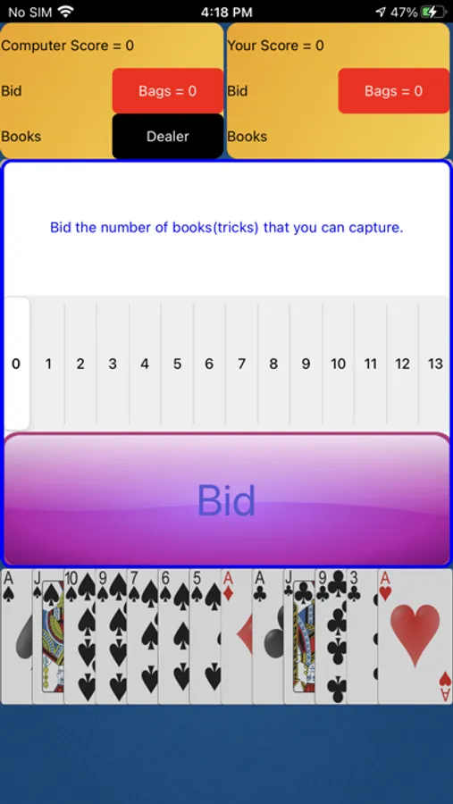 Players score points based on the number of tricks they win, as well as any bonus points earned from bidding before the game starts. The player who wins the most tricks in a round earns a bonus 10 points, known as a "bag". If a player accumulates 10 bags, they lose 100 points.