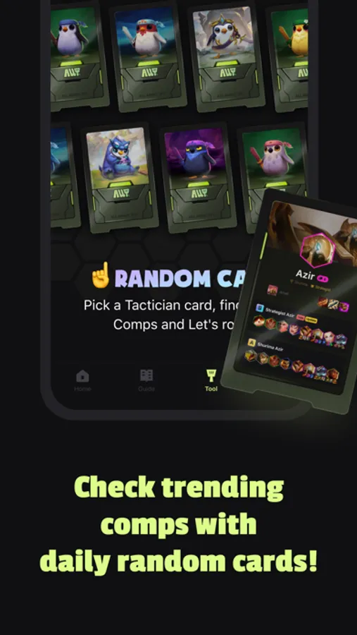 - Random Card: Featuring tacticians and today's comps complete with Team Build, Champions, Items, Synergies, and Augments