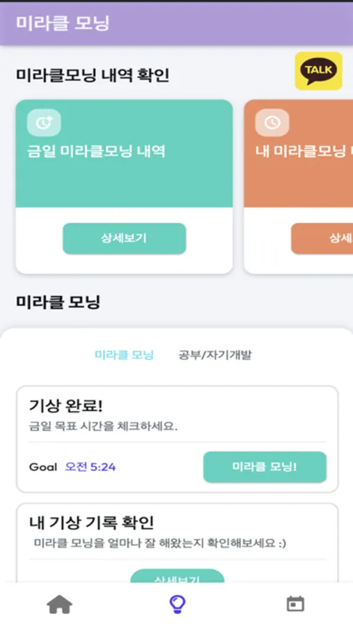 같이 미라클 모닝 하는 사람들과 기상시간을 공유하고, 내 미라클 모닝 실행 내역을 확인할 수 있습니다.