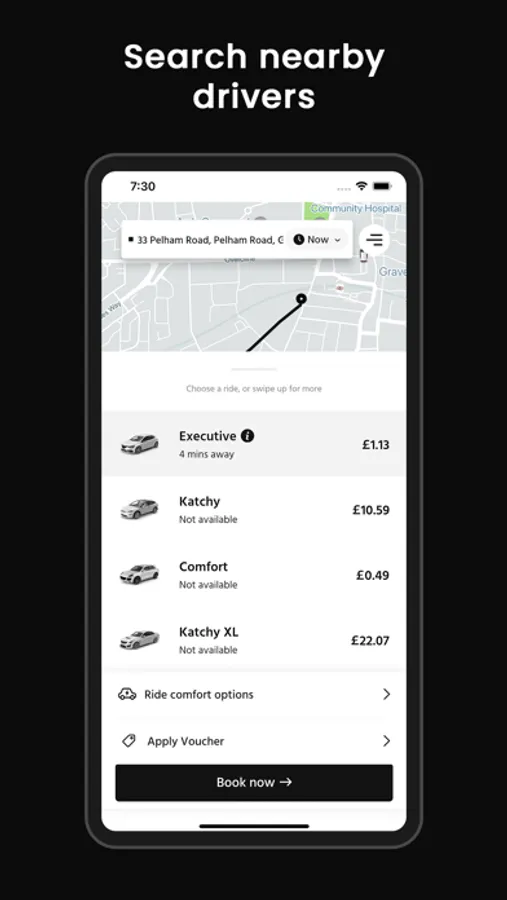 Katchy is a ride-sharing app that lets you request a low-cost ride, get picked up by a nearby driver, and enjoy your trip to your destination.