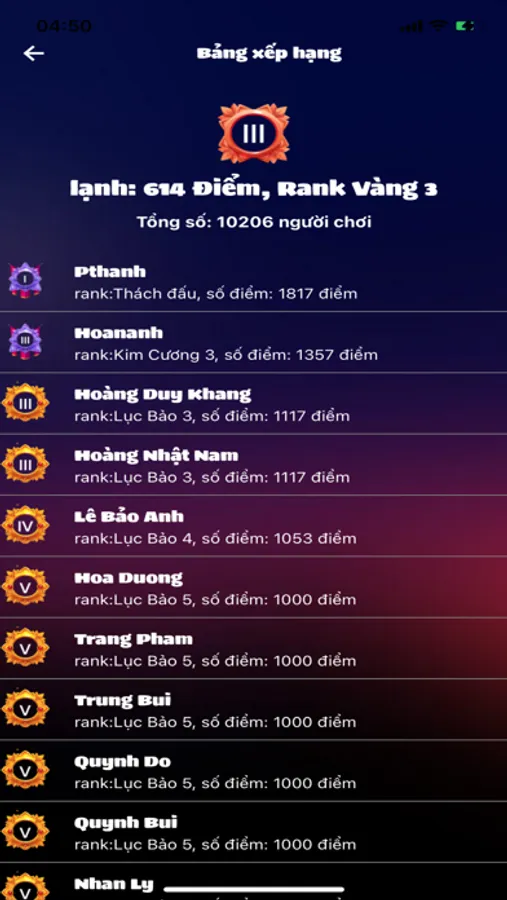 Bảng xếp hạng 7 cấp độ : ĐỒNG, BẠC, VÀNG, BẠCH KIM, LỤC BẢO, KIM CƯƠNG, THÁCH ĐẤU