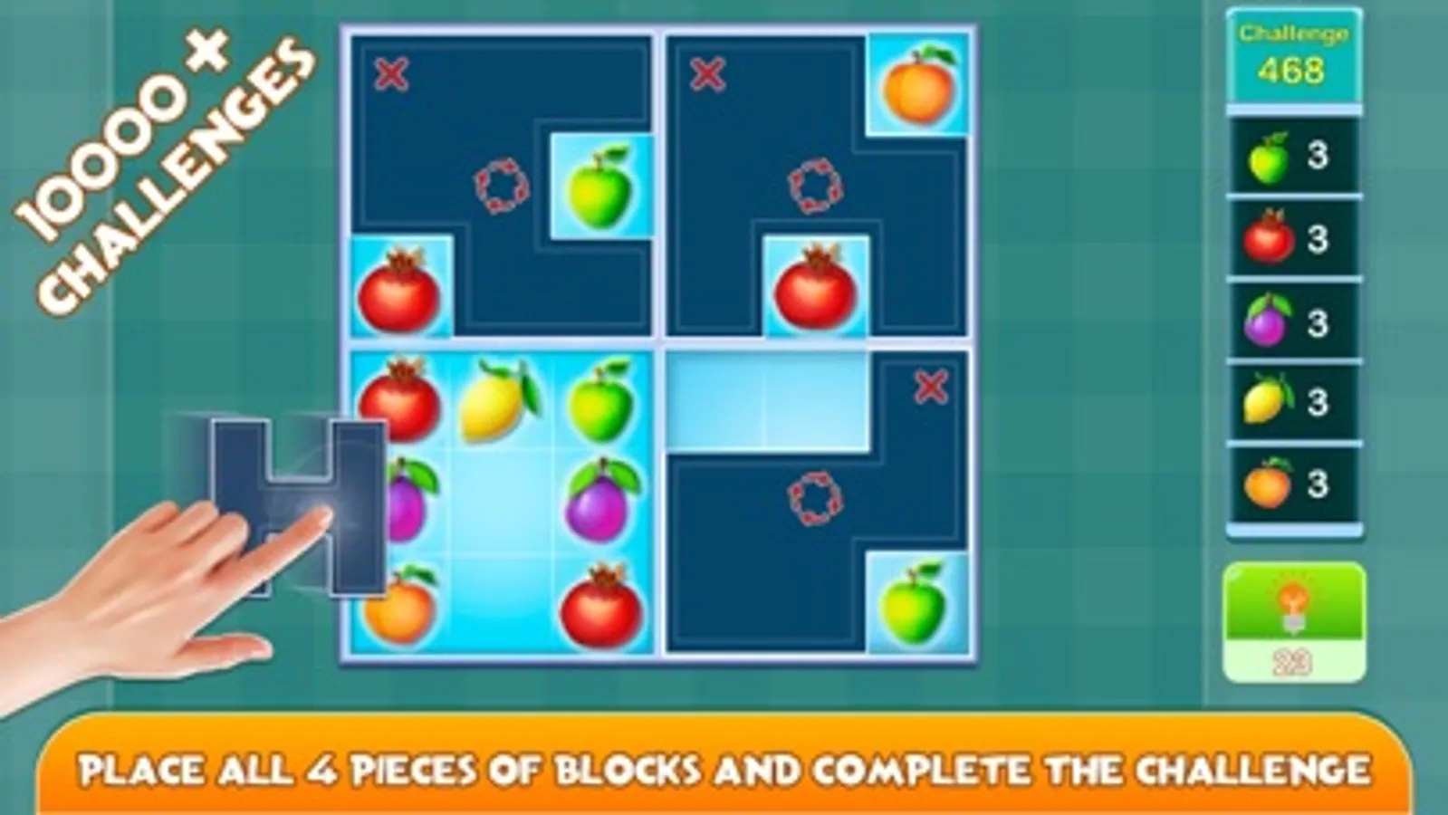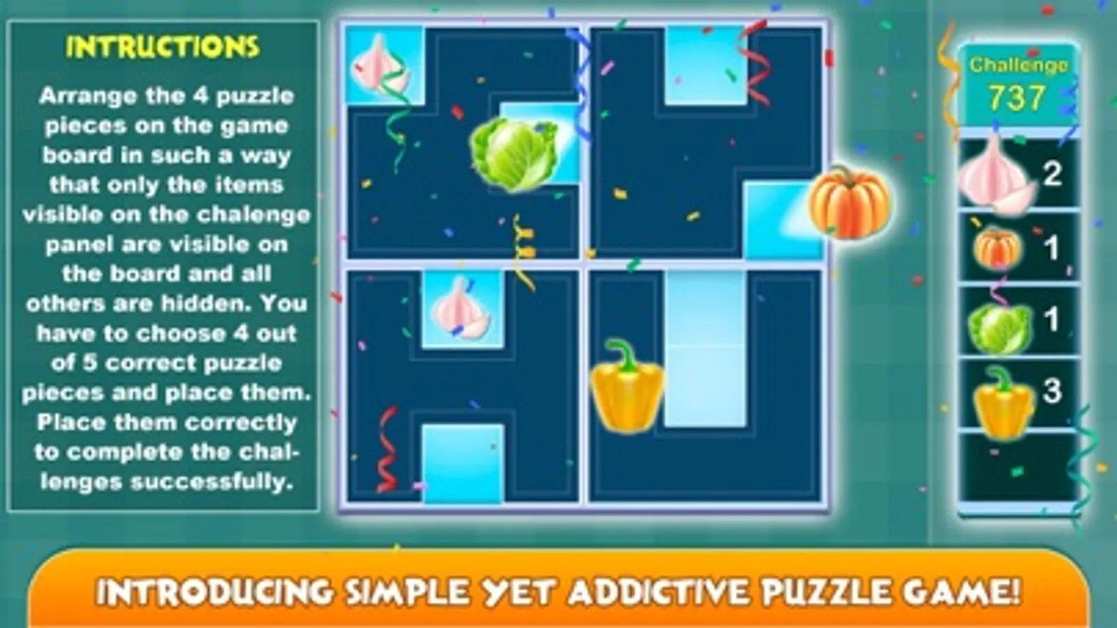 Arrange the 4 puzzle pieces on the game board in such a way that only the items visible on the challenge panel are visible on the board and all others are hidden. You have to choose 4 out of 5 correct puzzle pieces and place them correctly. Place them correctly to complete the challenges successfully. The unique features of this smart puzzle game makes more interesting than other block games. IQ games will keep your mind sharp and build up logic thinking ability. Block puzzle game is having clean interface and easy to play gameplay that works in phone and tablets as well. The game is simple matching game yet full of challenges. Take a move carefully in this brain teaser and solve the cube block challenge in this old game. Connect the block that exactly fit on the grid and solve the crazy block puzzle.