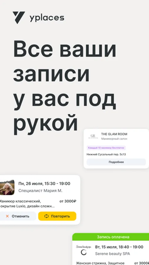 Записывайтесь к любимым специалистам на любые услуги в одном приложении. YPLACES объединяет салоны красоты и массажа, спортивные студии, медицинские клиники, автошколы и другие заведения сферы услуг. YPLACES работает на платформе YCLIENTS: если вы когда-то бронировали услуги через этот сервис, найдете историю своих визитов. Любой визит можно повторить нажатием одной кнопки: не придется снова искать студию и выбирать специалиста.